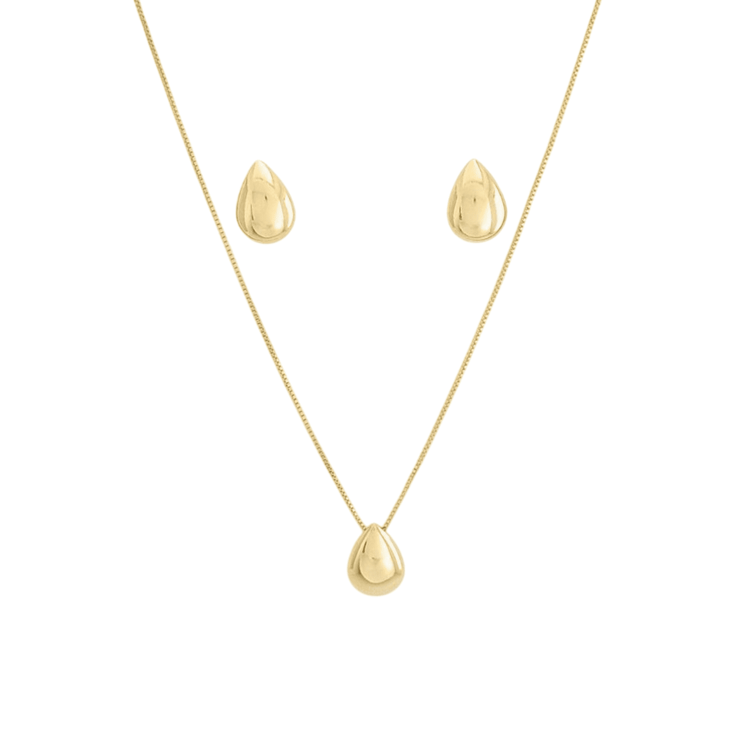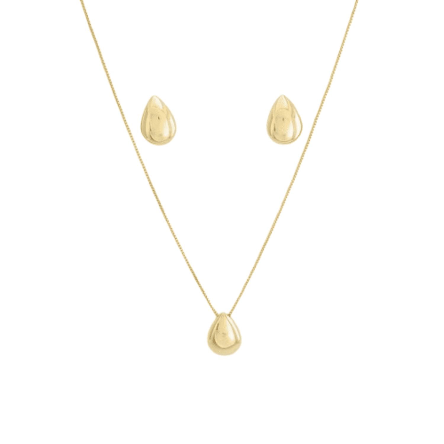 O Conjunto Colar e Brinco Gota Lisa Banhado a Ouro é uma semijoia hipoalergênica, livre de níquel. Composto por um colar corrente veneziana e um par de brincos. O pingente do colar e os brincos têm o formato de gota lisa e abaulada. Semijoia elegante e versátil para ser usada com diferentes estilos de roupa, tanto em ocasiões do dia a dia quanto em momentos especiais.